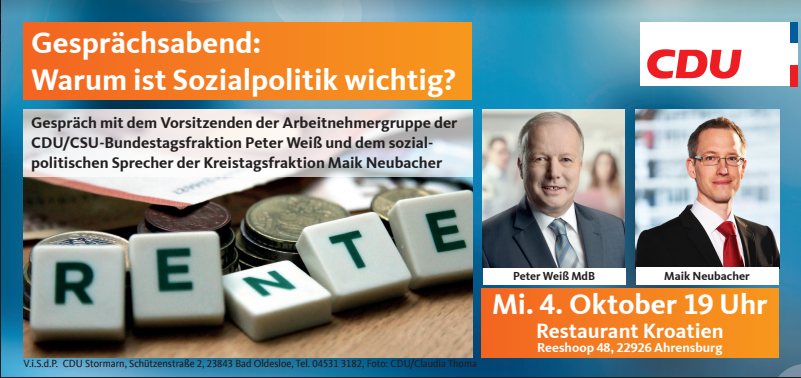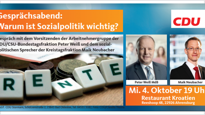 Unter dem Motto „Warum ist Sozialpolitik so wichtig?“ werden wir uns mit dem Vorsitzenden der Arbeitnehmergruppe der CDU/CSU-Bundestagsfraktion Peter Weiß MdB und dem sozialpolitischen Sprecher der CDU-Kreistagsfraktion, Maik Neubacher über die deutsche Sozialpolitik unterhalten. Und uns insbesondere über die Renten-, Gesundheits- und Pflegepolitik mit einander austauschen.