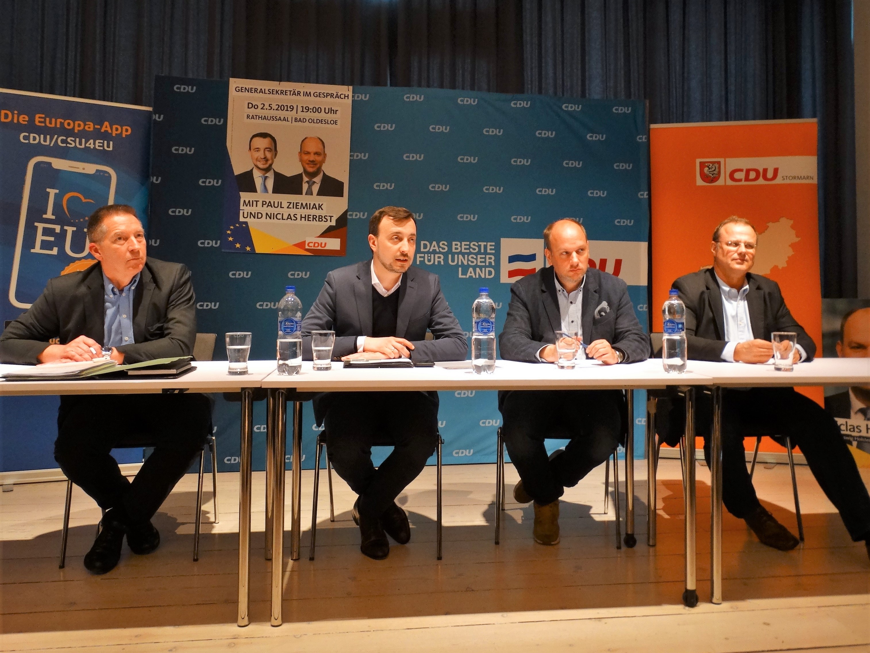 Namhafte Unterstützung aus Berlin für Niclas Herbst: Paul Ziemiak, der junge neue Generalsekretär der CDU, begleitete den Spitzenkandidaten der CDU in Schleswig-Holstein für die Wahlen zum Europäischen Parlament am 26. Mai bei zwei Wahlkampfauftritten in Stormarn, nachmittags beim Haustürwahlkampf in Reinfeld, abends im historischen Rathaus in Bad Oldesloe. Beim Gespräch im Rathaussaal brachte Ziemiak mit einer Erfahrung vom Tage in Stormarn ein grundsätzliches Dilemma der Europawahl auf den Punkt: „Ich habe heute zwei TV-Interviews gegeben, in denen es nur um Innenpolitik ging, und wenn von Europa die Rede war, dann nur von möglichen Auswirkungen des Wahlergebnisses für Angela Merkel, Annegret Kramp-Karrenbauer und die Bundespolitik.“